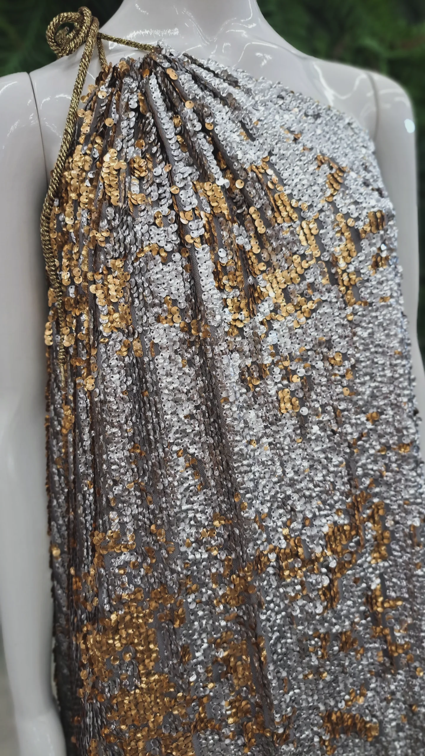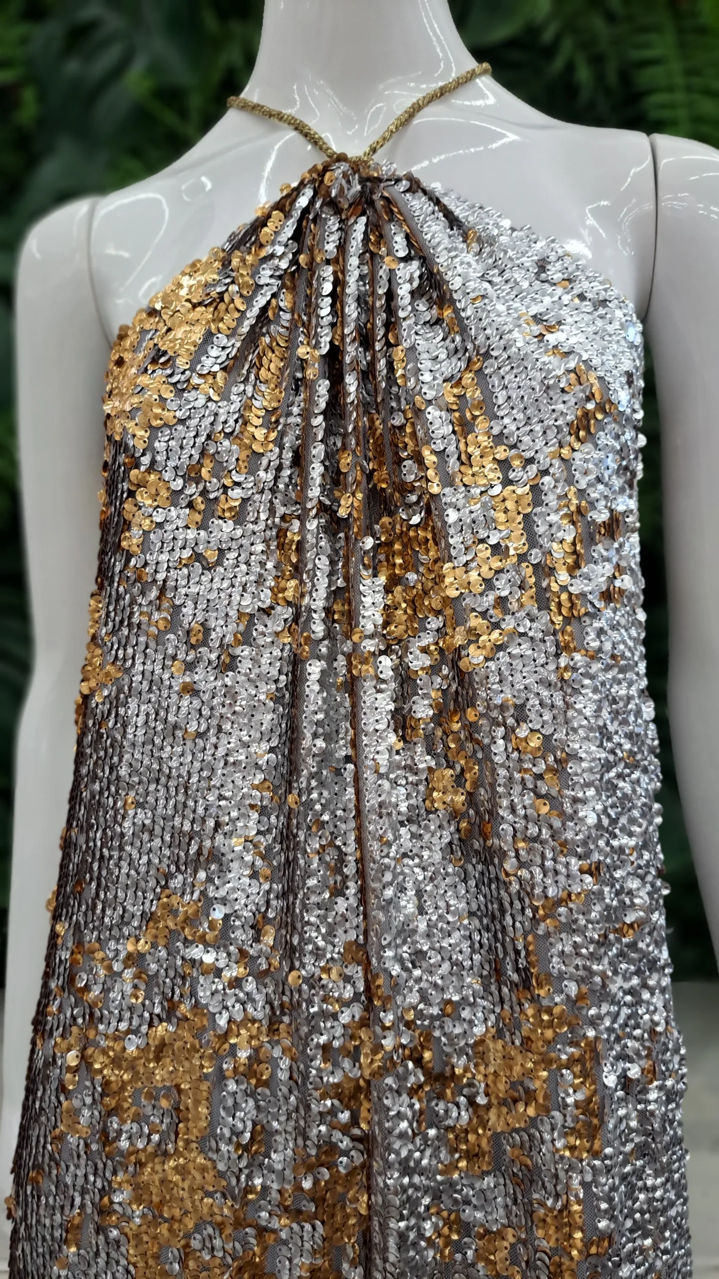 Vestido longo confeccionado em tule com paêtes, forrado e com amarração multformas.