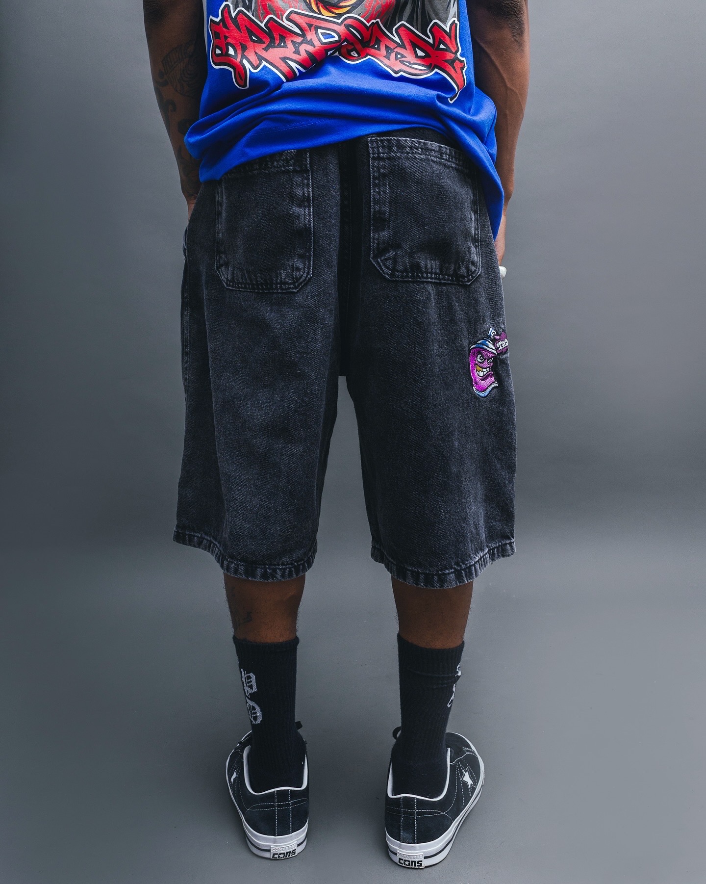 Bermuda baggy jeans, feita em tom estonado marmorizado, pra você que busca algo irreverente !